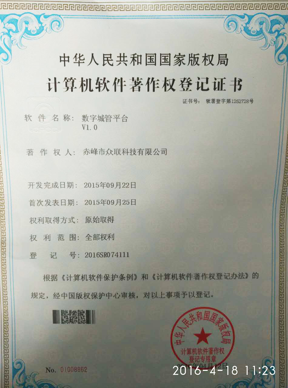 恭賀赤峰市眾聯科技有限公司通過大家的齊心協作,取得了“數字城管平臺”的軟件著作權!